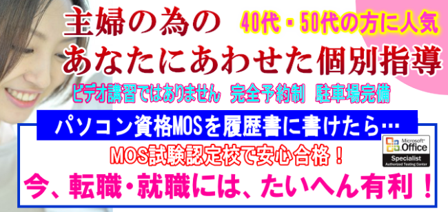 ●今はパソコンを使用していない仕事をしていますが、できれば事務職に転職をと考えています。それにはMOS資格が必要と言われたのでエムズパソコン姫路西教室の無料体験に参加しました。低価格で、しかも個別指導なので安心して受講することができます。お昼から仕事なので午前中に予約を入れて習っています。専用の無料駐車場が完備されているので、受講してそのまま職場に直行しています。入学してから1か月ほどですが来週にMOSワードとMOSエクセルを受験します。いつもの教室で受験できるので安心です。(31才・販売)